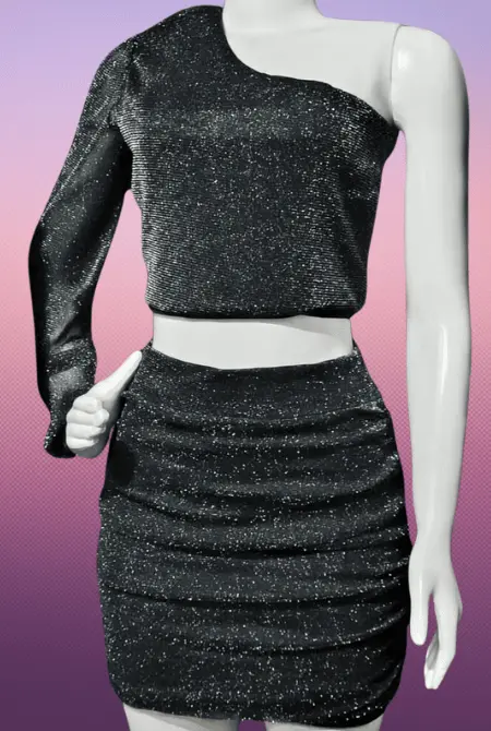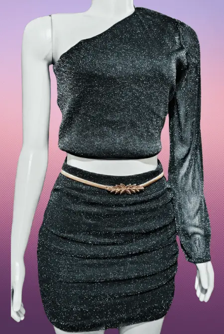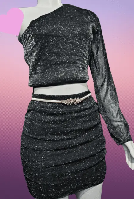 Este conjunto exclusivo é a escolha perfeita para mulheres elegantes que valorizam o luxo e o estilo. A blusa, com design assimétrico de uma única manga, traz sofisticação e um toque de ousadia, enquanto a saia com elástico nas laterais proporciona um ajuste confortável e moderno. Com um acabamento impecável e detalhes em brilho e transparência, essa peça exala glamour e é ideal para eventos e festas especiais.